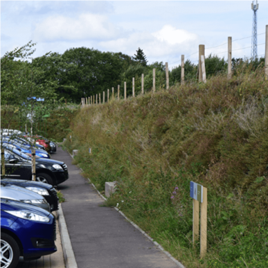 At Eastwood Health and Care Centre, Morgan Sindall used the TensarTech GreenSlope system to construct a 250 m long, 3 m high environmental berm with side slopes at a steep 70° angle. This approach significantly reduced the volume of fill required and eliminated the need for imported material, as all fill was sourced on-site. Transportation costs were minimised and project costs were reduced by utilising on-site materials to create a natural, vegetated finish.