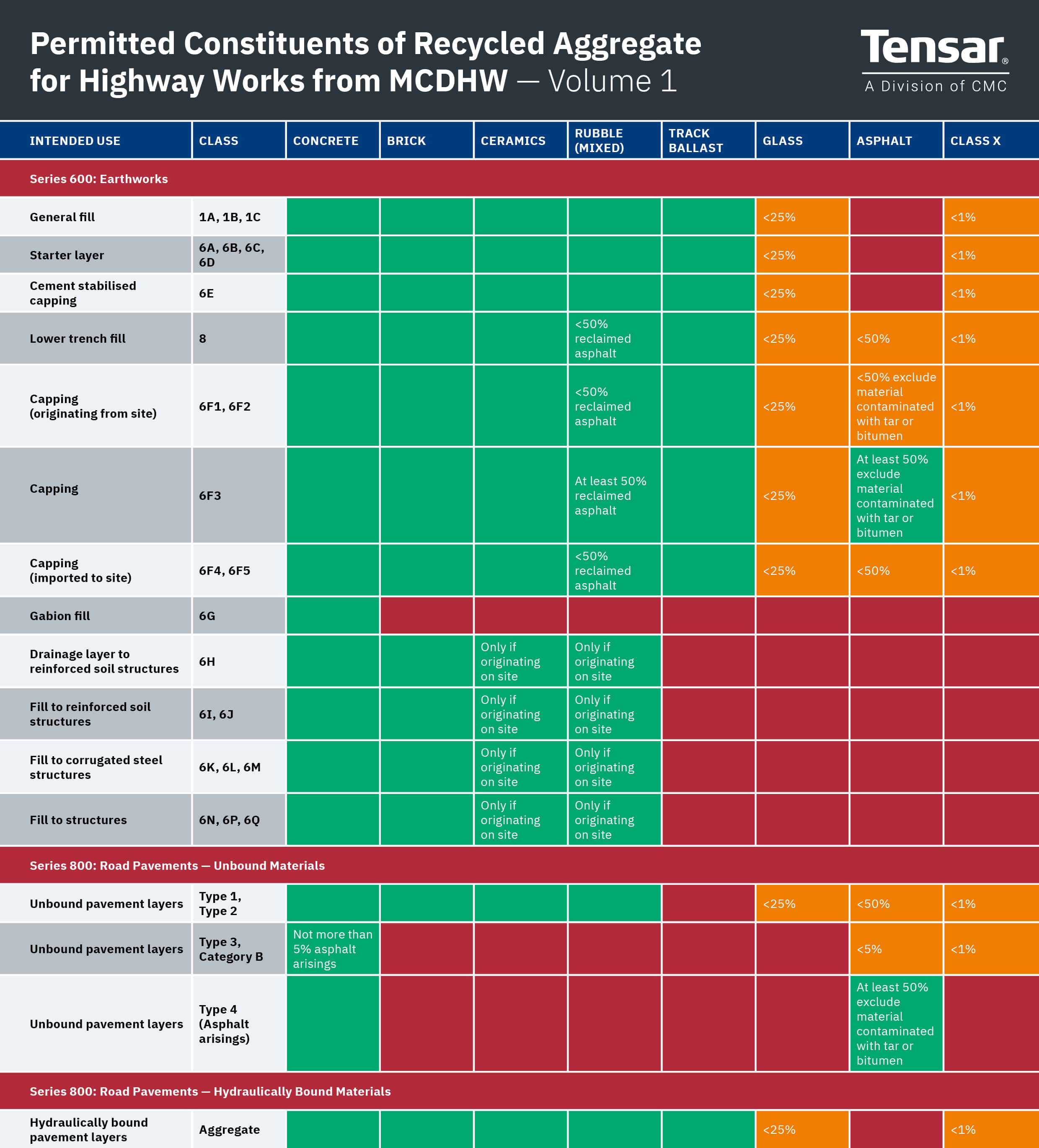 MCDHW Series 800 defines five Types of unbound mixtures for use in road pavements. Recycled aggregates are accepted for all Types. The permitted constituents vary, in particular with respect to the allowable asphalt content. Types 1 and Type 2 limit the asphalt component to a maximum of 50%. Type 3 limits the asphalt content to 5%, while Type 4 is predominantly sourced from asphalt arisings and has a minimum asphalt content of 50%. All aggregate materials are required to comply with requirements of BS EN 13242. Table 1 sets out the permitted constituents for recycled aggregates used in unbound and hydraulically bound pavement layers. The performance of unbound pavement layers, whether using primary or recycled aggregates, can be improved by the use of Tensar stabilisation geogrids to improve pavement life.