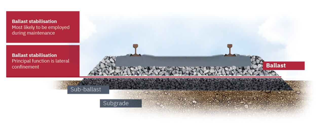 Mechanical stabilisation of the ballast layer, typically with a large aperture product to account for the ballast material grading, has been proven to significantly reduce the particle movement and rotation within the zone of confinement of the stabilisation geogrid.