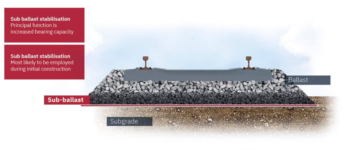 Therefore, increasing the strength of the sub-ballast or foundation layer through geotechnical solutions increases bearing capacity, reduces settlements, and helps maintain track alignment. One such method of achieving this is to strengthen the sub-ballast layer by incorporating a stabilisation geogrid, typically at the base of the granular material, with additional layers introduced where necessary to ensure continuity of mechanical stabilisation throughout the sub-ballast..jpg)