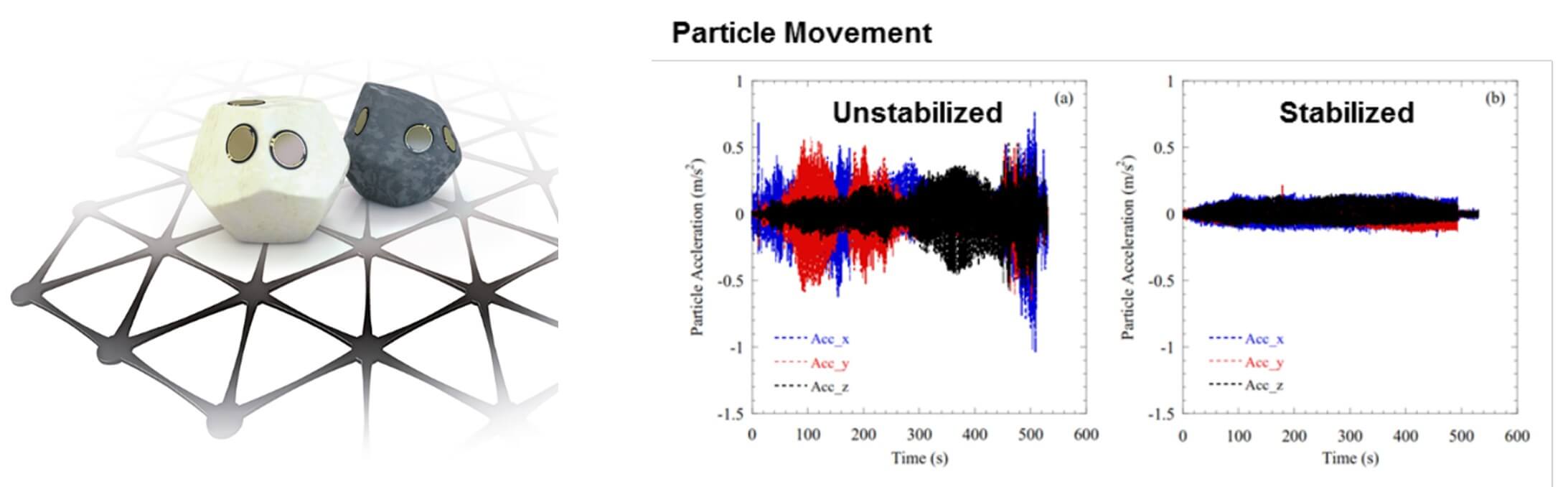 ‘SmartRock’ research undertaken demonstrated a significant reduction in particle movement and rotation as a result of the introduction of a mechanical stabilisation geogrid