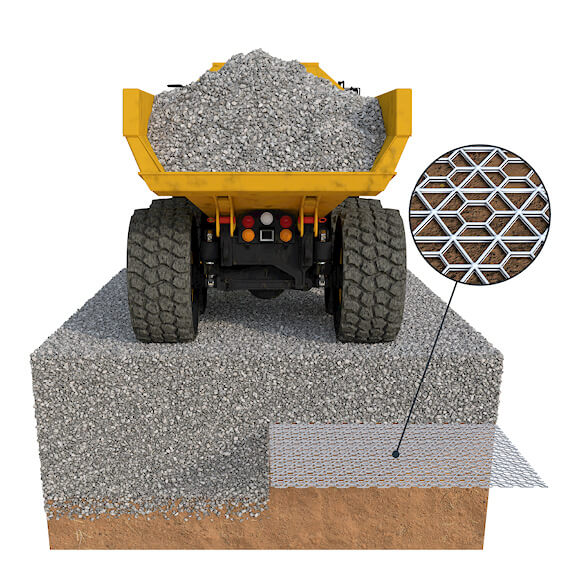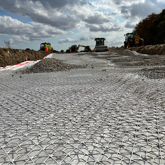 The increased strength and stiffness of a Tensar mechanically stabilised layer allows for a thinner aggregate layer to be used over weak soil, reducing imported materials cost and associated CO2 emissions.
