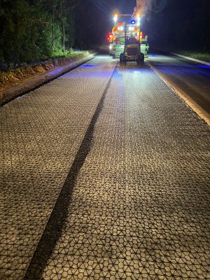 The reinforced layer created prolongs service life, by offering incredible resistance to reflective cracking and mitigating longitudinal cracking caused by differential settlement between new and existing lanes on widened roads. It can also reduce surface rutting, particularly in low stiffness asphalt mixes subjected to slow and heavy wheel loading at high temperatures.