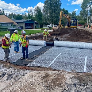 The City of Flagstaff, Arizona is two hours north of Phoenix, AZ in the San Francisco Mountains. The geology in the project area is made up of a mixture of volcanic rocks and moisture sensitive silty clay. Despite long-term drought conditions, Flagstaff experiences a months-long monsoon season during the summer in which they get microbursts of rain almost every day. Runoff has increased over the past few years to the point where the City must use sandbags in areas to prevent residences and businesses from flooding. To deal with these conditions, the original plan was to put down two layers of Type 2 BX geogrid with 2 feet of aggregate base course for stabilisation and five inches of asphalt concrete on top. This plan would have been very expensive to execute because of the amount of haul off, aggregate base, and asphalt concrete required. The City worked with Tensar to figure out a more cost-effective and constructable plan that could handle the moisture and be carried out in wet conditions, given the frequent microbursts which would likely occur during construction.