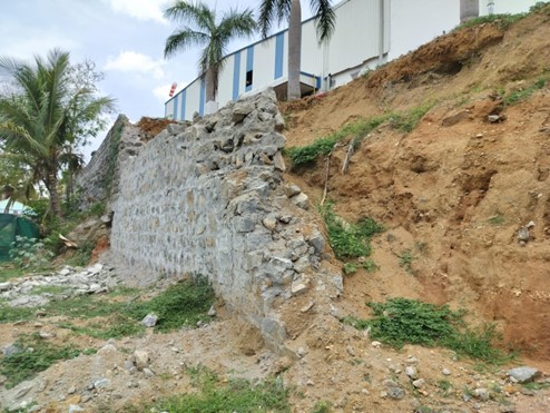 Tensar proposed a geogrid reinforced soil wall using uniaxial geogrids with gabion fascia—a proven, economical alternative to conventional reinforced cement concrete (RCC) walls. The complete solution included design, drawings, and on-site supervision, ensuring quality construction appropriate drainage measures. Tensar solution allowed the reuse of salvaged rocks from the failed wall, reduced costs, construction time, and enhanced sustainability.